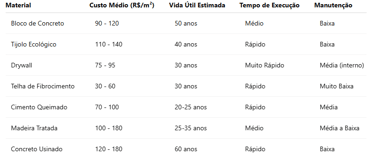 Ao avaliar os materiais de construção mais baratos e duráveis em 2025, torna-se essencial comparar aspectos como o custo por metro quadrado instalado, tempo médio de aplicação, vida útil e exigência de manutenção. Abaixo, apresentamos uma visão geral aproximada: